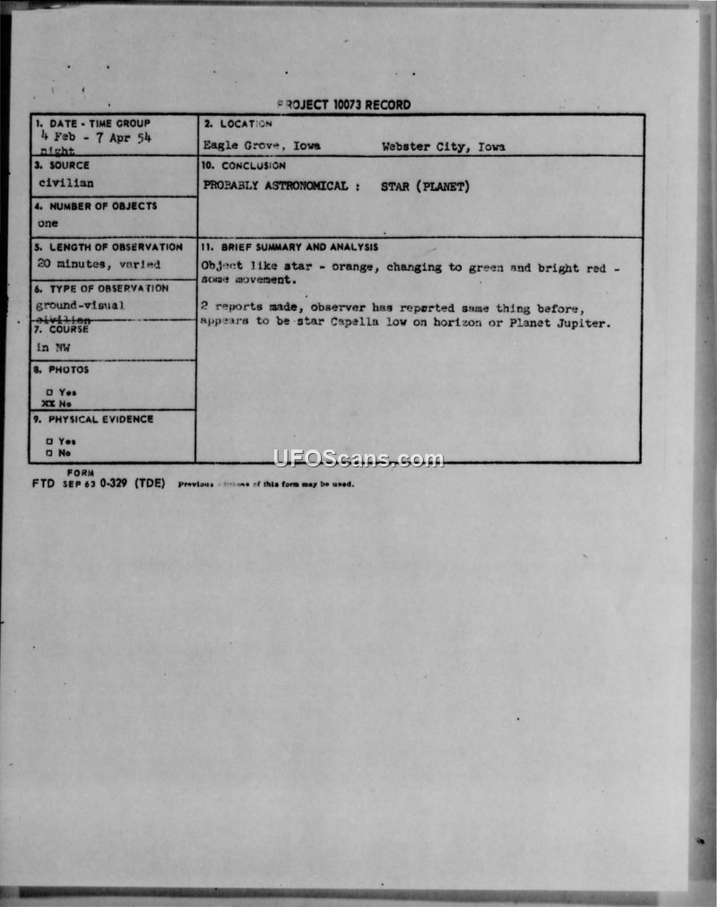 A police officer in Webster City, Iowa, reported repeated sightings of an unidentified object between February and April 1954. While the Air Force suggested astronomical causes like Jupiter or Capella, the official reports ultimately categorized the cause as unknown.