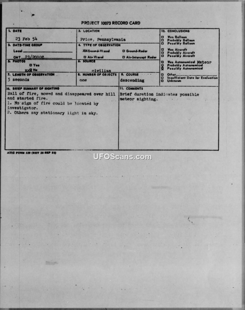 Project 10073 Record Card — Price, Pennsylvania, 23 February 1954