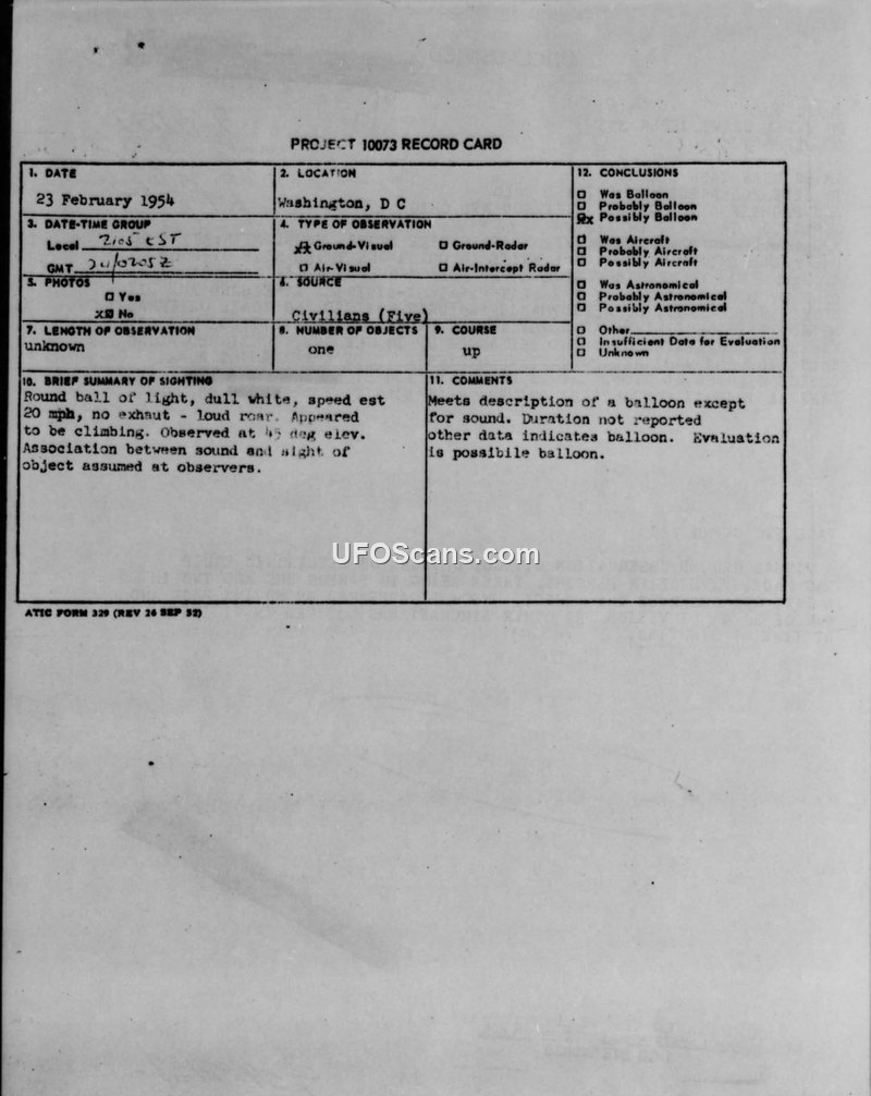 Project 10073 Record Card — Washington, D.C., 23 February 1954