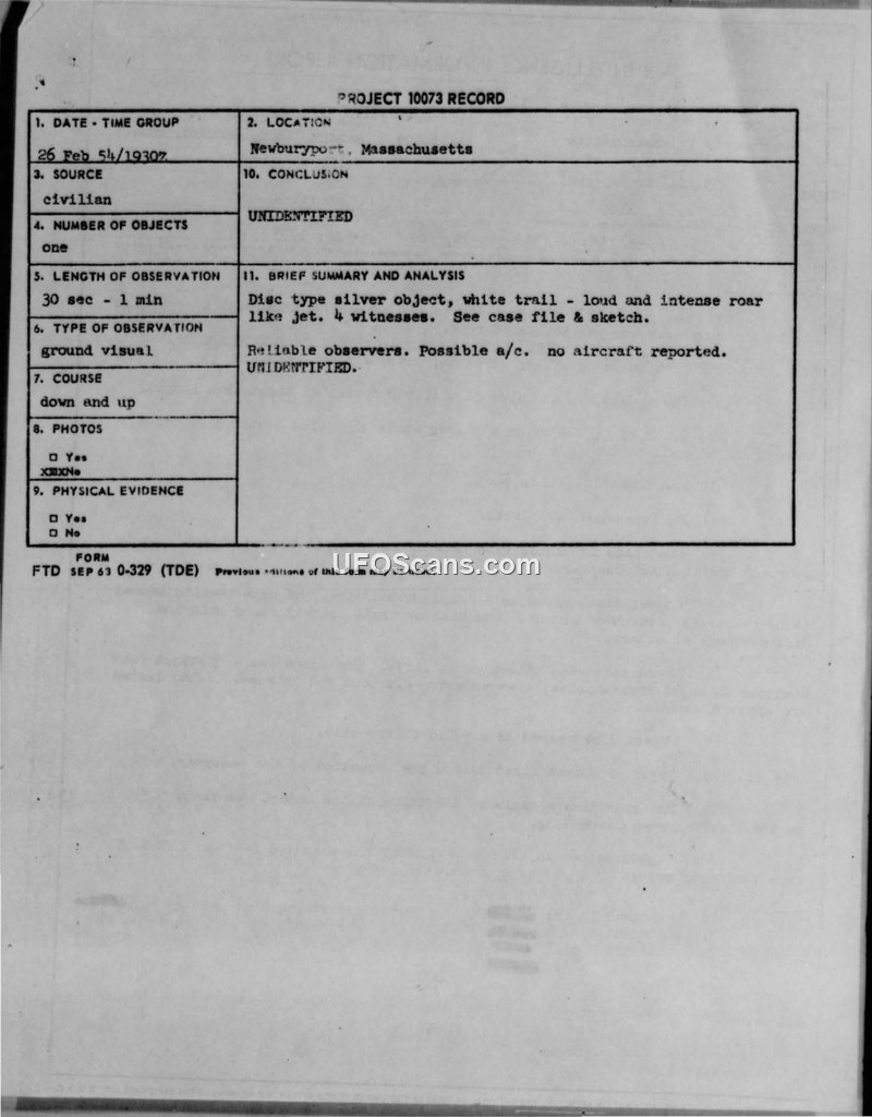 Project 10073 Record: Unidentified Flying Objects (UFOs) - Newburyport, Massachusetts