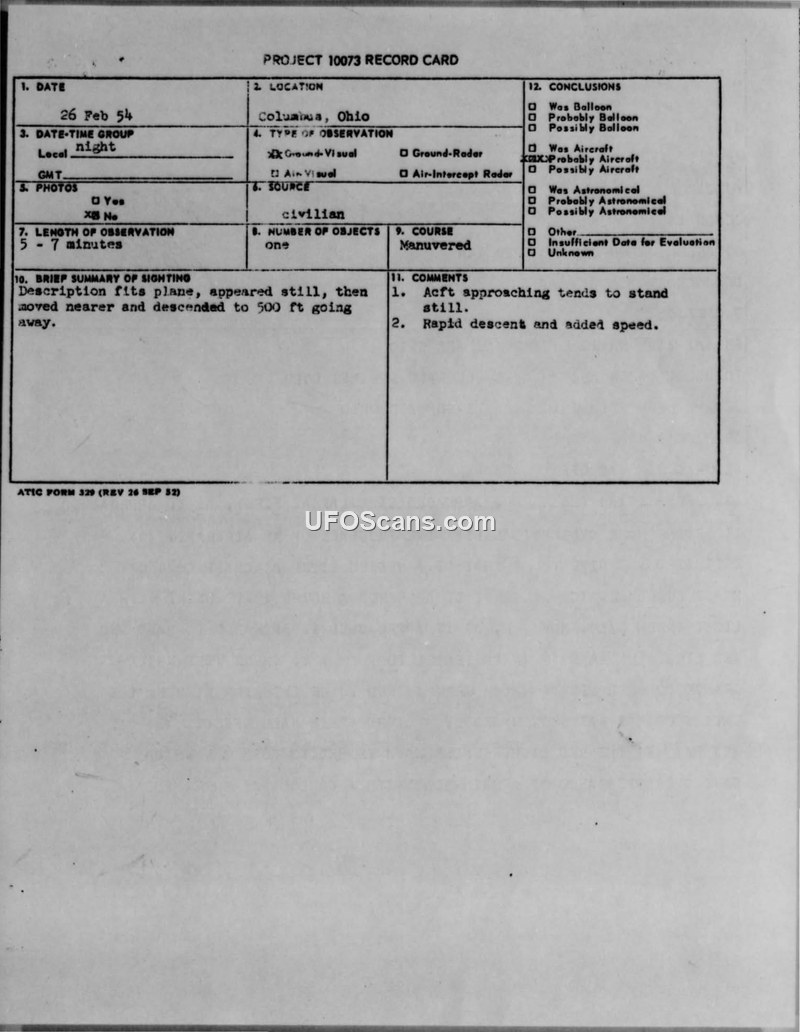 Project 10073 Record Card — 26 February 1954, Columbus, Ohio