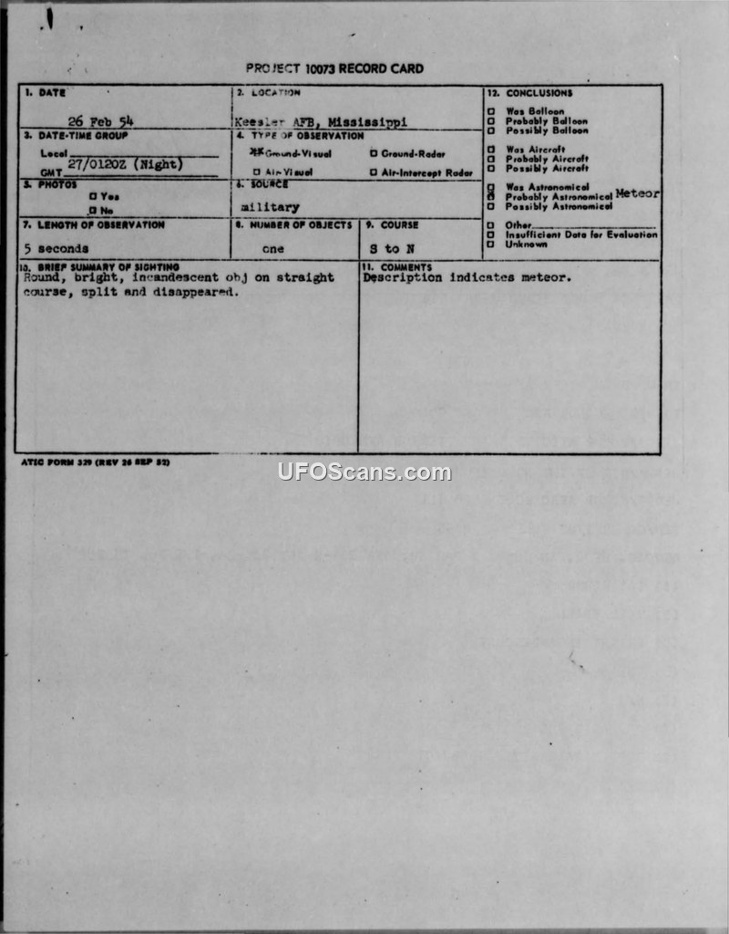A 1954 sighting report from Keesler AFB describes a bright, solid, round object that split and disappeared. The official military conclusion identified the phenomenon as a meteor.