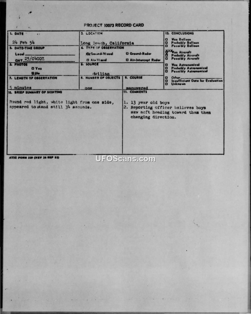 Project 10073 Record Card — Long Beach, California, 24 February 1954