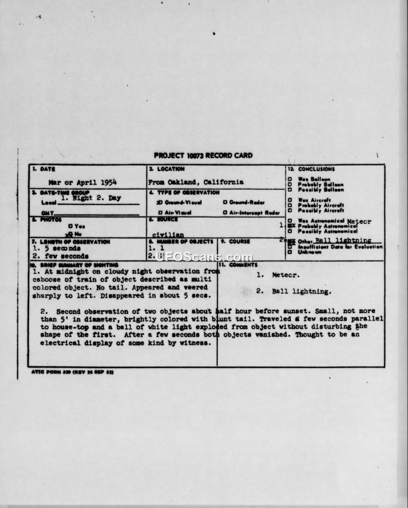 A civilian witness reported two sightings of unidentified objects in Oakland, California, in 1954. The Air Technical Intelligence Center evaluated these as a meteor and ball lightning.