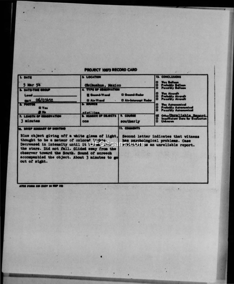 A 1954 UFO sighting report from Chihuahua, Mexico, was officially dismissed by the U.S. Air Force after the witness's subsequent correspondence suggested psychological instability. The file includes a Project 10073 record card and internal military correspondence regarding the case.