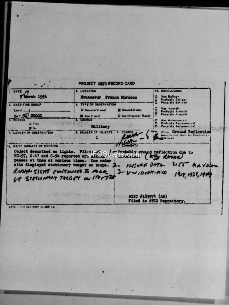 This Project 10073 record card documents an unidentified aerial phenomenon sighting that occurred on March 5, 1954, at 2000Z in the vicinity of Nouasseur, French Morocco. The report details an encounter involving the crews of three military aircraft: a KC-97, a C-47, and a C-54. These pilots reported observing lights that made multiple passes at their aircraft at various times. Simultaneously, a ground-based radar site reported a stationary target on its scope. The official conclusion reached by the Air Technical Intelligence Center (ATIC) was that the sighting was likely a ground reflection caused by an atmospheric inversion. The document notes that while the event was initially categorized as unidentified and lacking sufficient data, the final assessment favored the ground reflection explanation. The record is filed under ATIC #183974 (AB) within the ATIC repository.