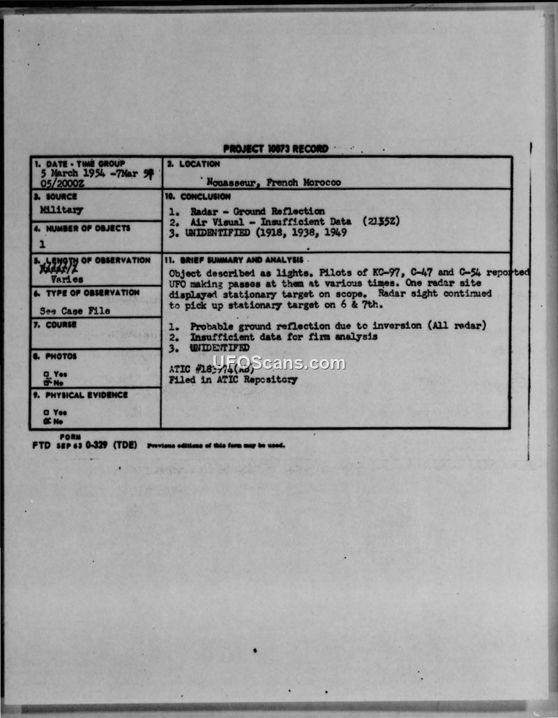 Unidentified Flying Objects, Vicinity, Nouasseur Air Depot, French Morocco, 5-12 March 1954