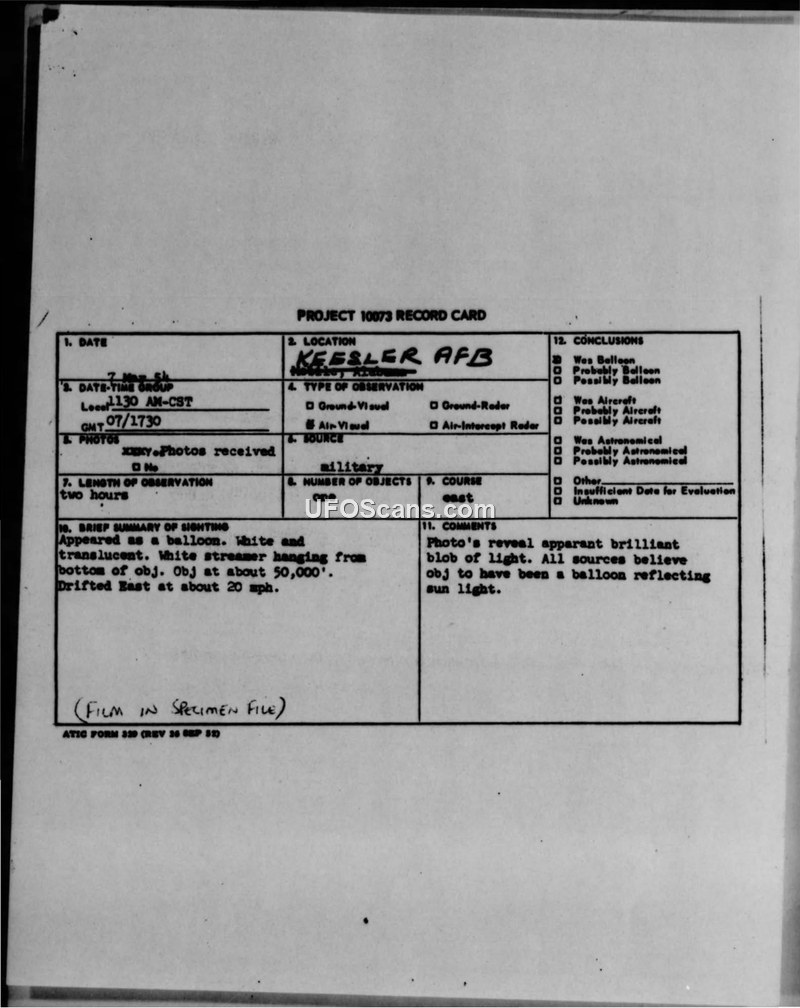 Project 10073 Record Card — Keesler AFB, 7 March 1954