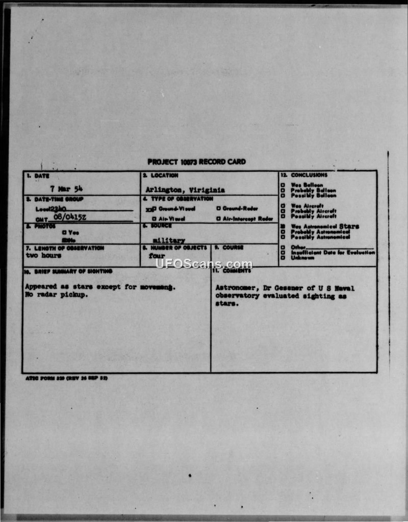 Project 10073 Record Card: Sighting at Arlington, Virginia, 7 March 1954