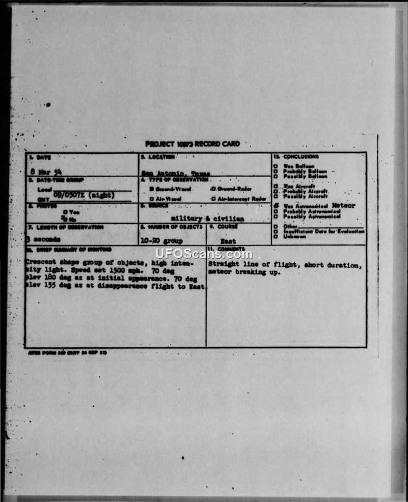 Project 10073 Record Card — San Antonio, Texas, 8 March 1954