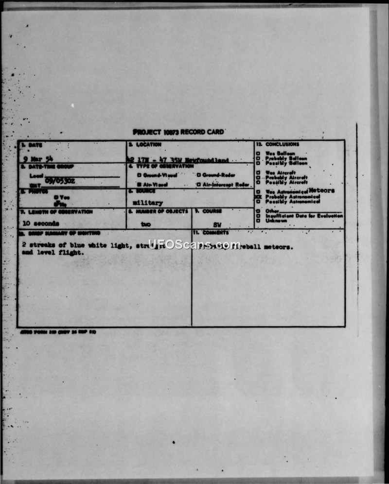 A 1954 military report detailing a sighting of two blue-white, high-speed objects over the Atlantic. The reporting officer concluded there was no standard explanation for the event, despite a later notation suggesting they were likely fireball meteors.