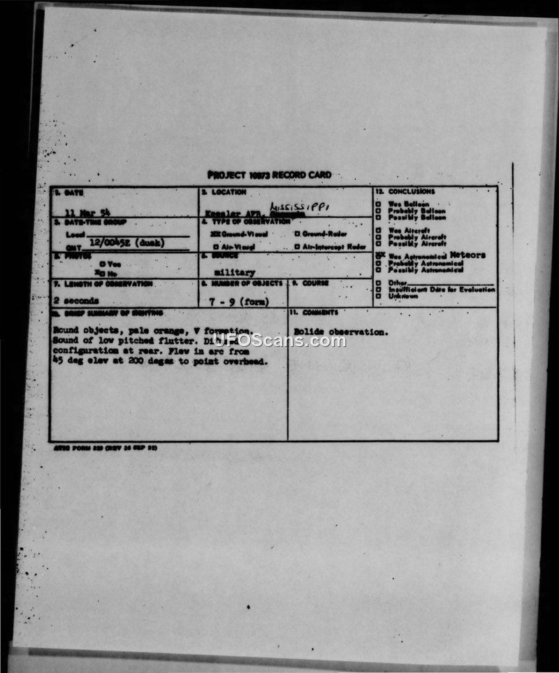 A weather analyst at Keesler AFB reported a V-formation of 7-9 pale orange objects on March 11, 1954. The official conclusion categorized the event as a bolide observation.