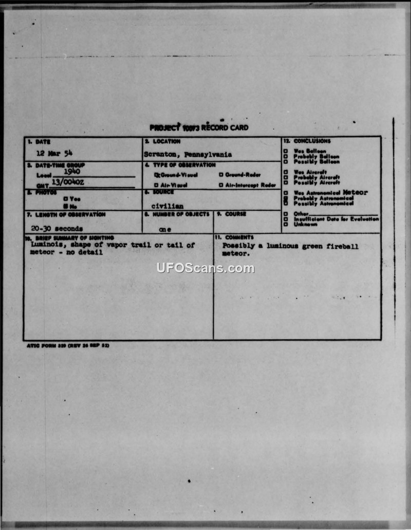 A civilian in Scranton, PA, reported a luminous, vapor-trail-like object on 12 March 1954. Military radar logs showed no activity, and the event was officially categorized as a possible meteor.