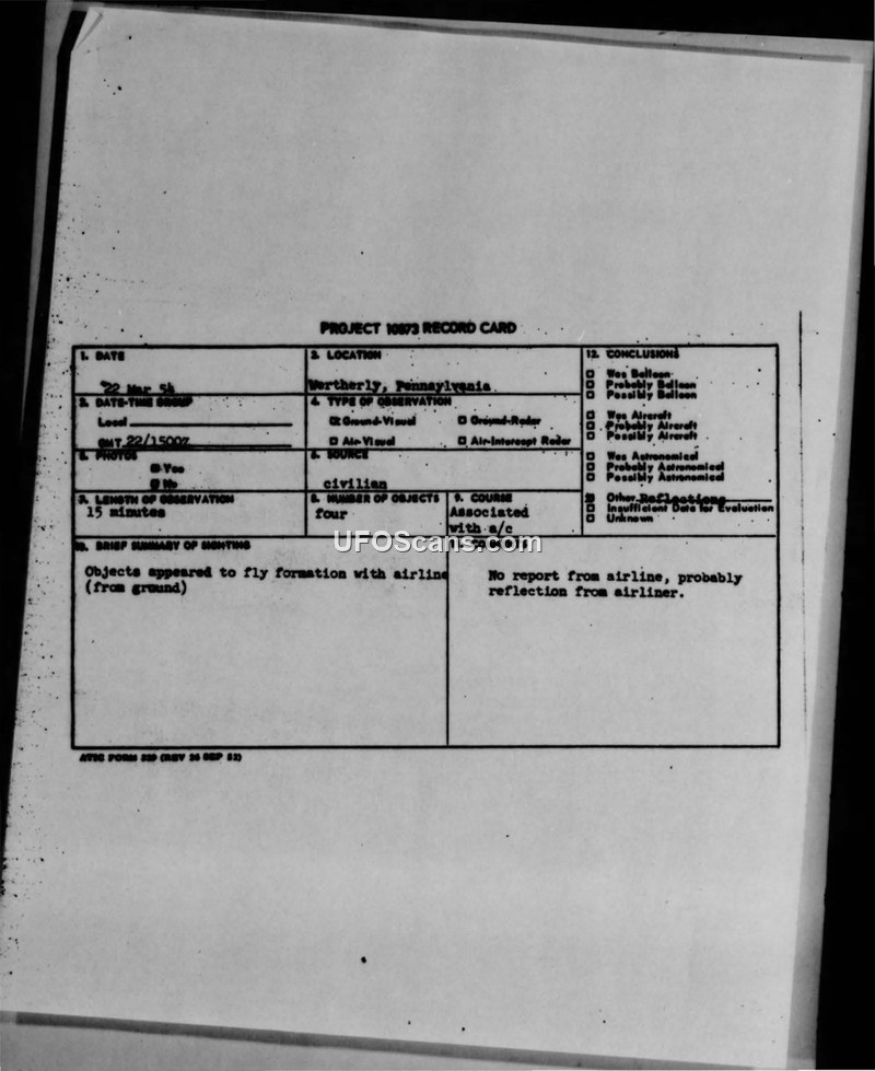 Project 10873 Record Card — Wertherly, Pennsylvania, 22 Mar 54