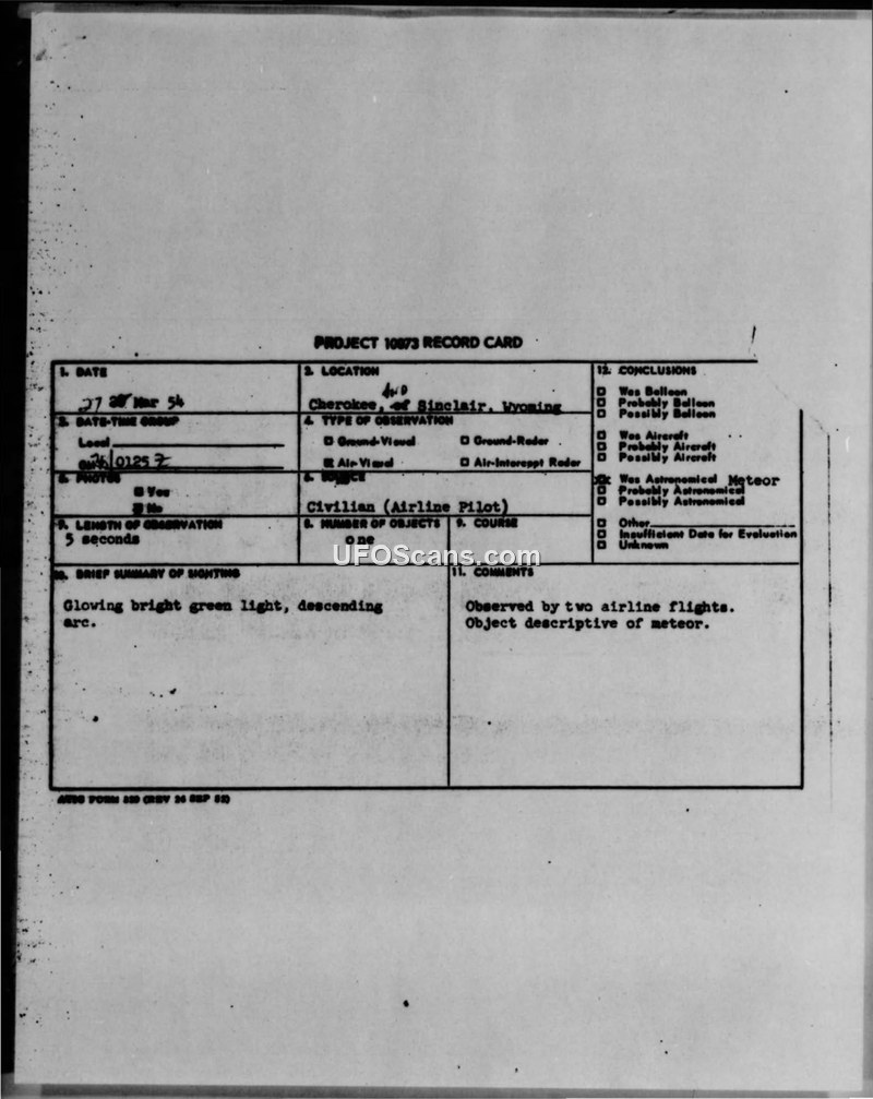 This document consists of a Project 10873 record card and an associated military cable detailing an aerial sighting that occurred on March 27, 1954. The incident involved a glowing bright green object observed by two airline flights near Cherokee, Wyoming. According to the report, the object was first sighted at an altitude of 19,000 feet mean sea level, approximately 12 miles east of Cherokee. The witnesses described the object as appearing 12 to 15 degrees above the horizon before it followed a slanting downward trajectory, moving 30 degrees to the left of the vertical, and eventually disappearing behind a cloud bank. The duration of the observation was recorded as five seconds. Weather conditions at the time were noted as clear over an undercast with a high cloud bank. The sighting was confirmed by the pilot and co-pilot of the aircraft. A secondary report mentioned in the cable notes that another observation was made by a pilot five miles west of Sinclair, Wyoming, at 13,000 feet mean sea level at the same time. The official conclusion reached by the investigating authorities was that the object was a meteor, noting that the description provided by the witnesses was consistent with such a phenomenon.