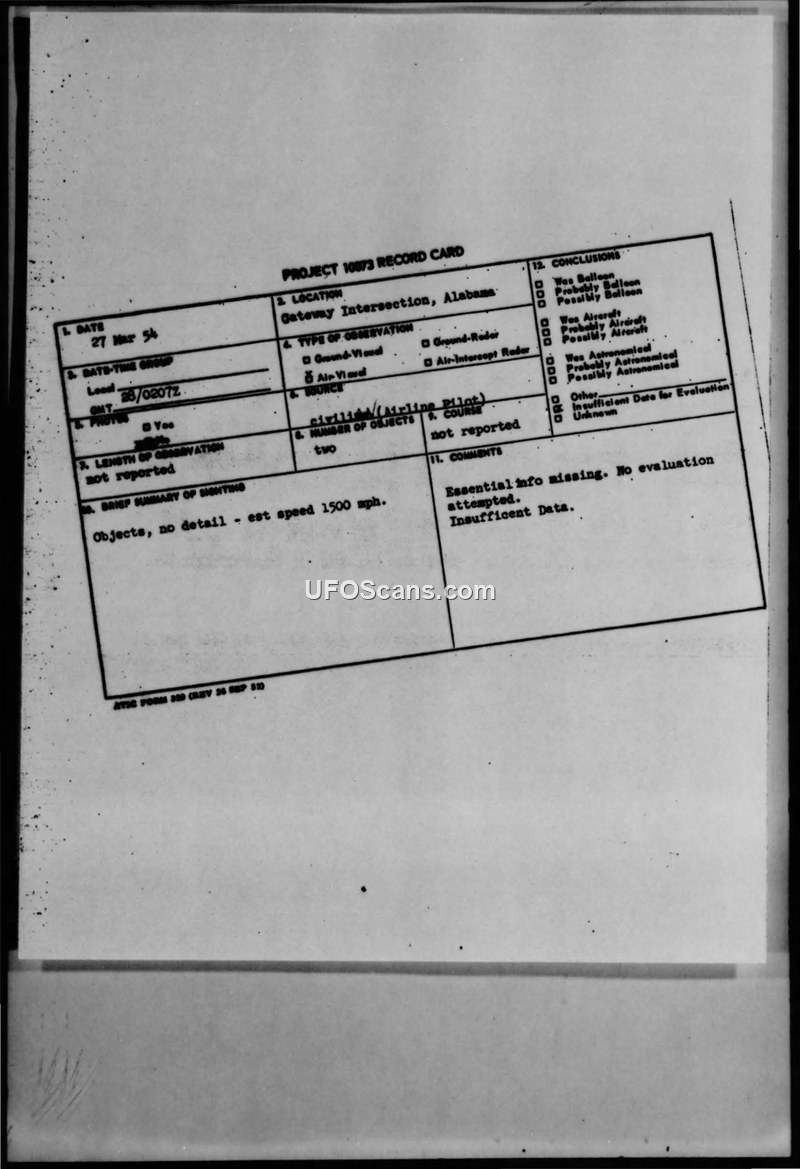 A civilian airline pilot reported two high-speed objects over Alabama on March 27, 1954. The military investigation concluded that the report lacked sufficient data for a formal evaluation.