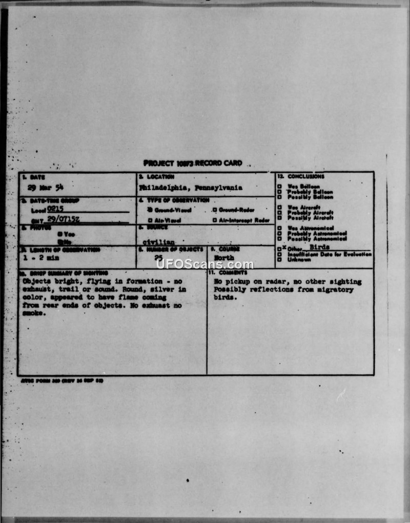 This report details a 1954 sighting of 25 unidentified objects over Philadelphia. Despite witness reports of silver, flame-emitting objects, the Air Force concluded the event was likely caused by migratory birds.