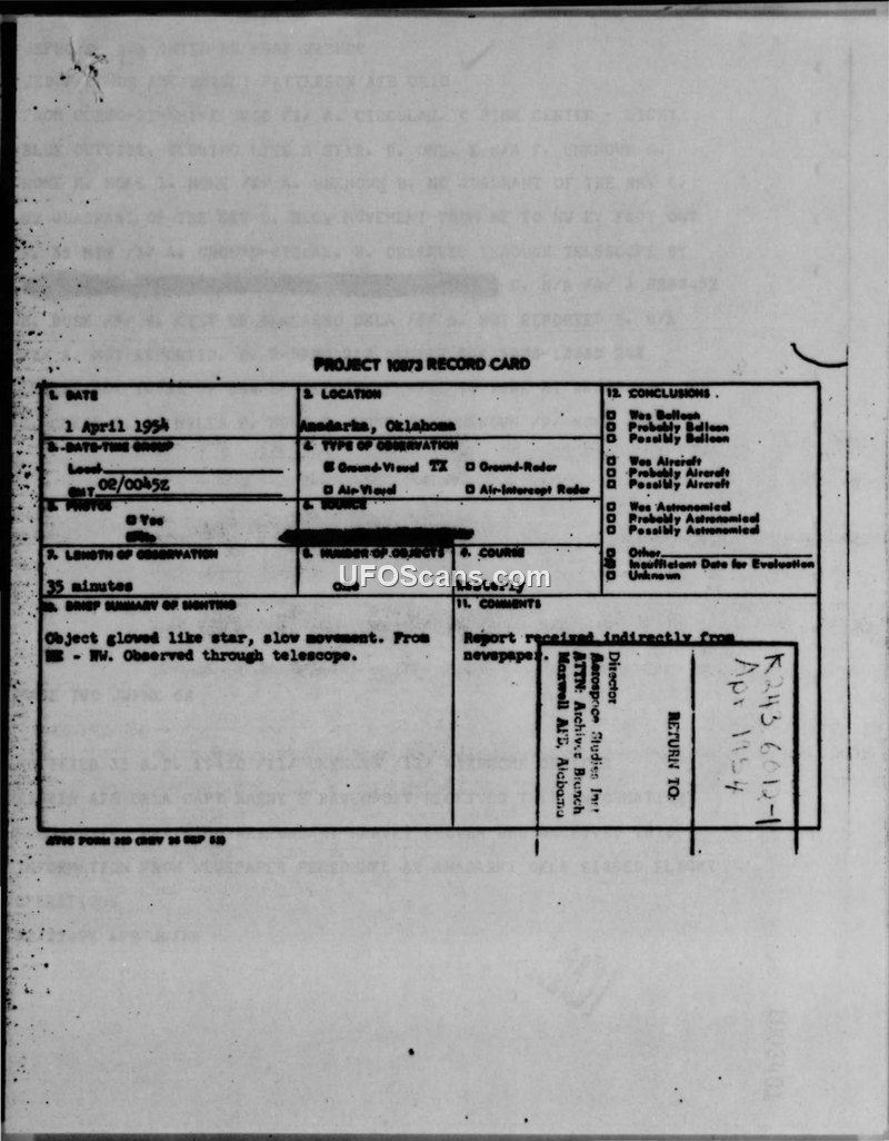 Project 10073 Record Card: Sighting in Anadarko, Oklahoma, 1 April 1954