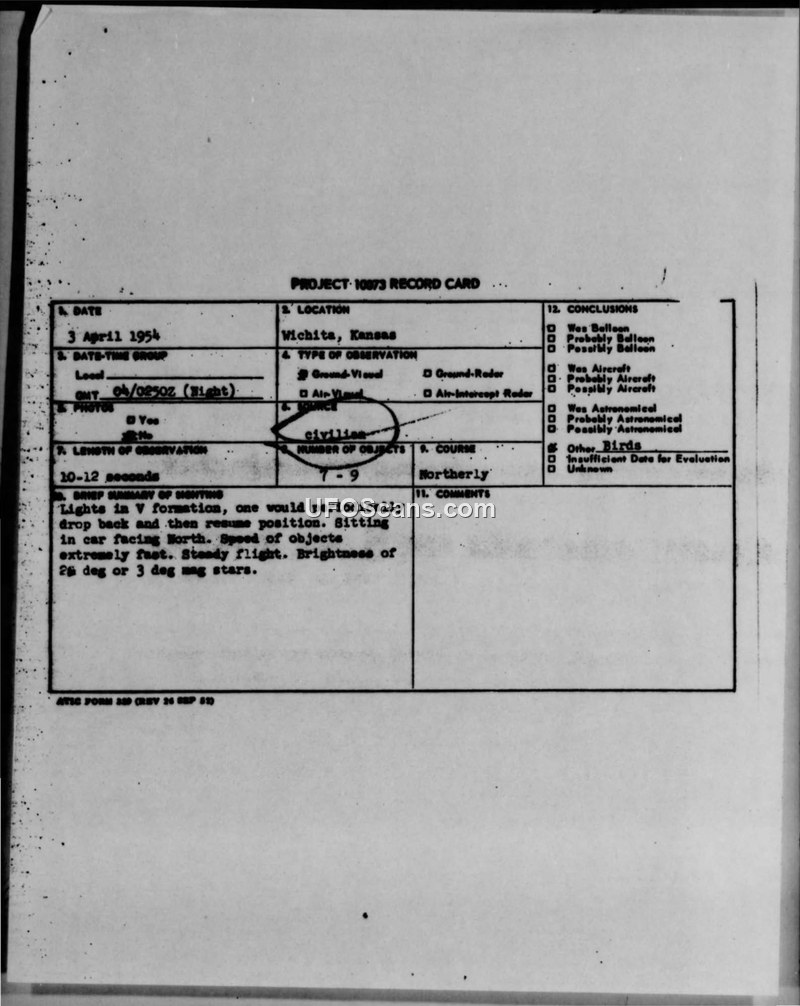A witness in Wichita, Kansas, reported seven to nine lights in a V formation on 3 April 1954. Military investigation, including radar checks, yielded no explanation for the sighting.