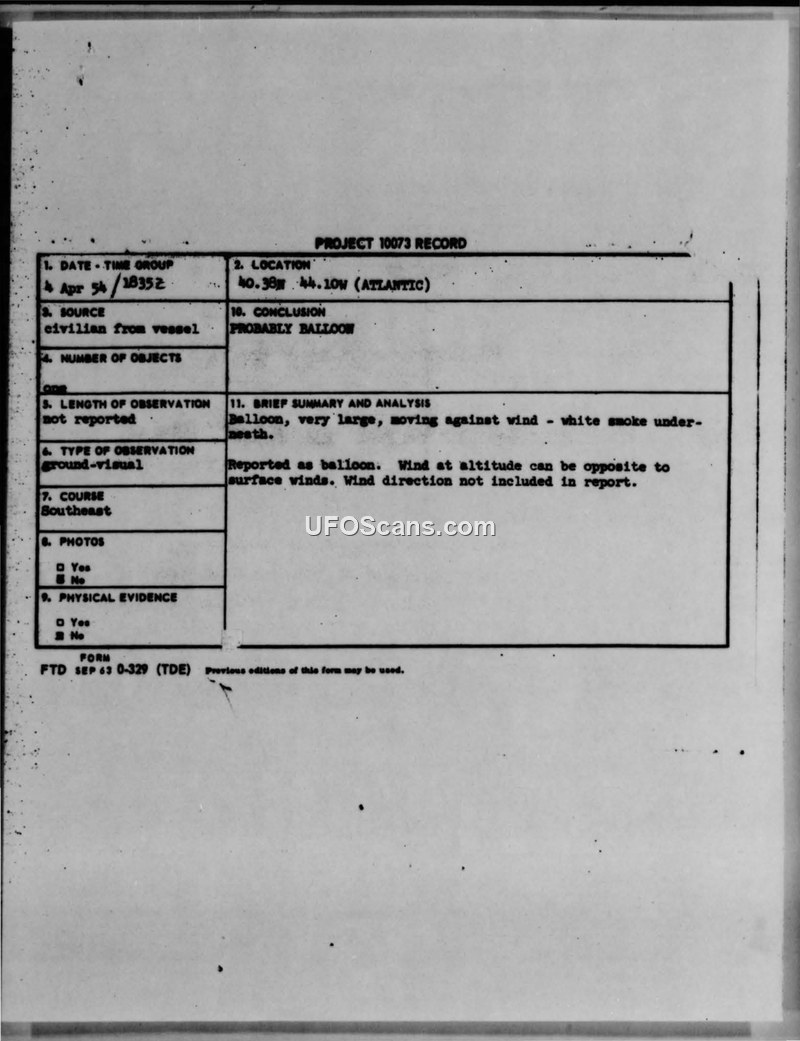 A civilian vessel reported a large object with white smoke in the Atlantic on April 4, 1954. The military investigation concluded the object was likely a balloon, noting that high-altitude winds can differ from surface winds.