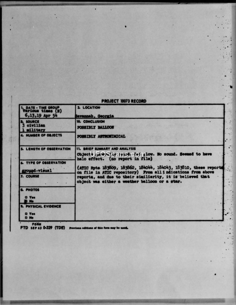 This document is a Project 10073 record detailing sightings that occurred in Savannah, Georgia, on April 6, 13, and 19, 1954. The observations involved three civilians and one military witness. The objects were described as being generally round in shape, exhibiting a red glow, and appearing to have a halo effect. No sound was associated with the sightings. The record notes that there was no specific report on file for these incidents. However, the Air Technical Intelligence Center (ATIC) evaluated these sightings in conjunction with other reports held in their repository, specifically referencing reports 183809, 183862, 184044, 184043, and 183810. Due to the similarity between the Savannah sightings and these other documented cases, the official conclusion reached by the investigators was that the objects were likely either a weather balloon or a star. The document is a standard form, FTD SEP 63 0-329 (TDE), used for recording such incidents.