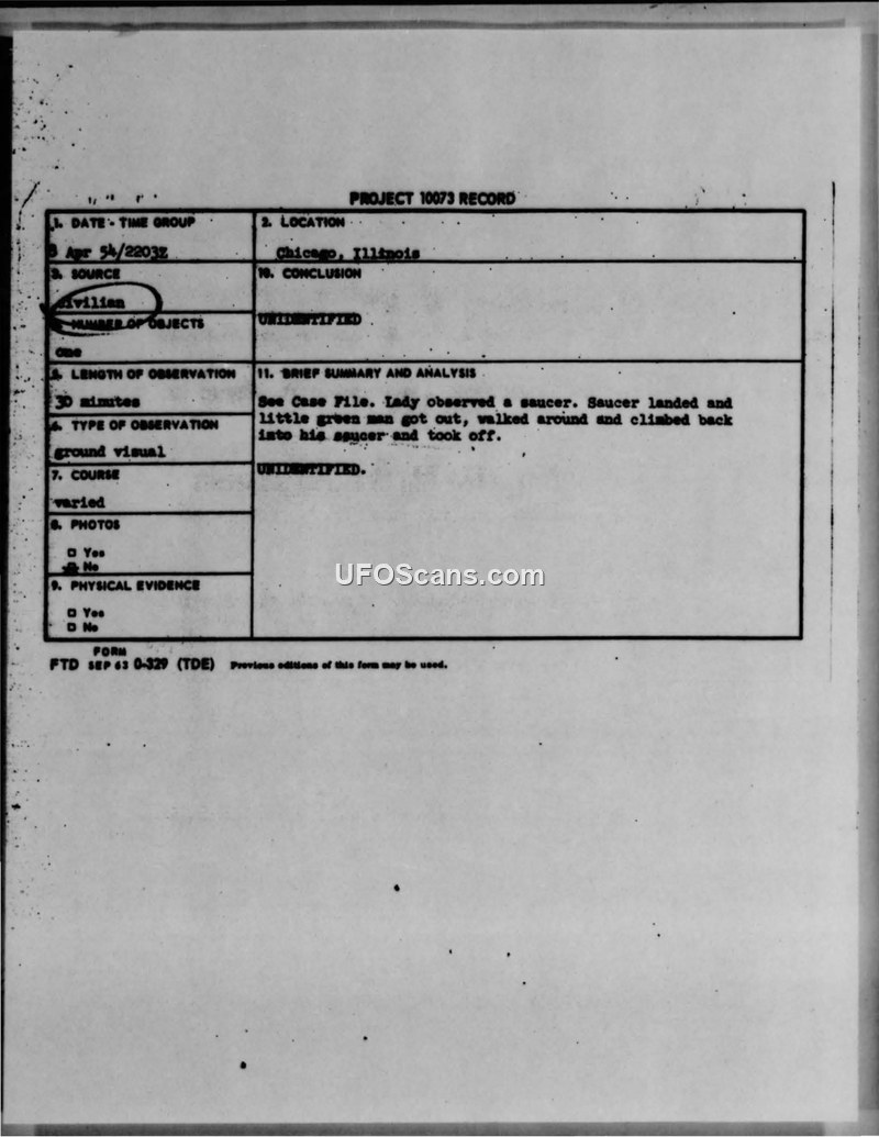 Project 10073 Record: Unidentified Object Sighting, Chicago, Illinois, April 1954