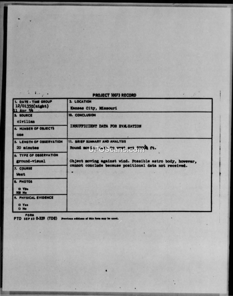 Project 10073 Record — Kansas City, Missouri, 12 April 1954
