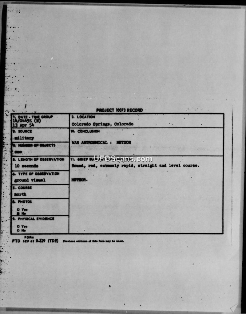 Project 10073 Record: Sighting Report - Colorado Springs, Colorado, 14 April 1954
