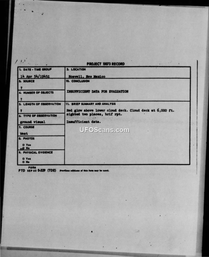 A report of a dull reddish glow sighted near Roswell, New Mexico, on 14 April 1954. The military investigation concluded there was insufficient data to evaluate the phenomenon.
