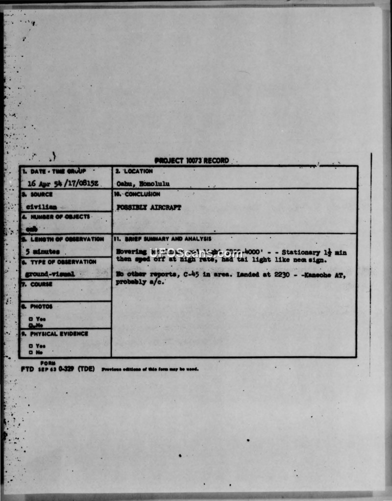 Project 10073 Record: Sighting Report - Oahu, Honolulu, 16 April 1954