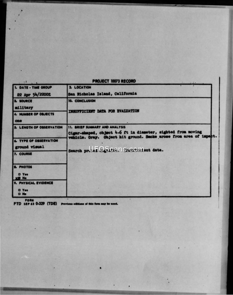 A Navy sailor reported a small, cigar-shaped object crashing on San Nicolas Island in 1954. Extensive searches, radar checks, and radiation surveys by military personnel yielded no evidence of the object or its impact.