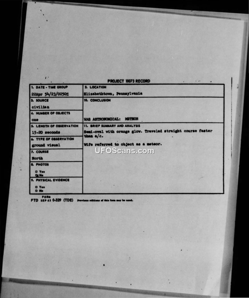 Project 10073 Record: Sighting in Elizabethtown, Pennsylvania, 22 April 1954