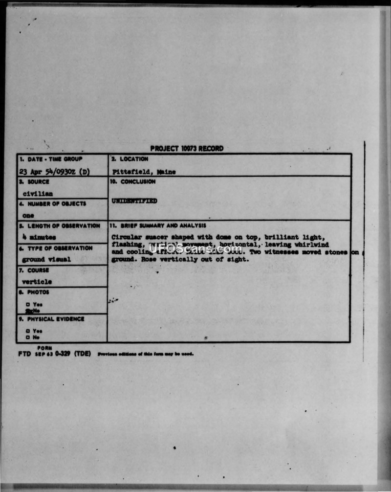 Project 10073 Record — Sighting in Pittsfield, Maine, 23 April 1954