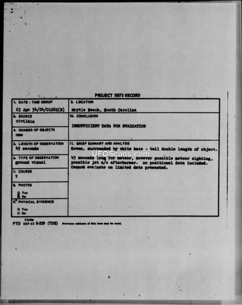 Project 10073 Record: Sighting at Myrtle Beach, South Carolina, 23 April 1954