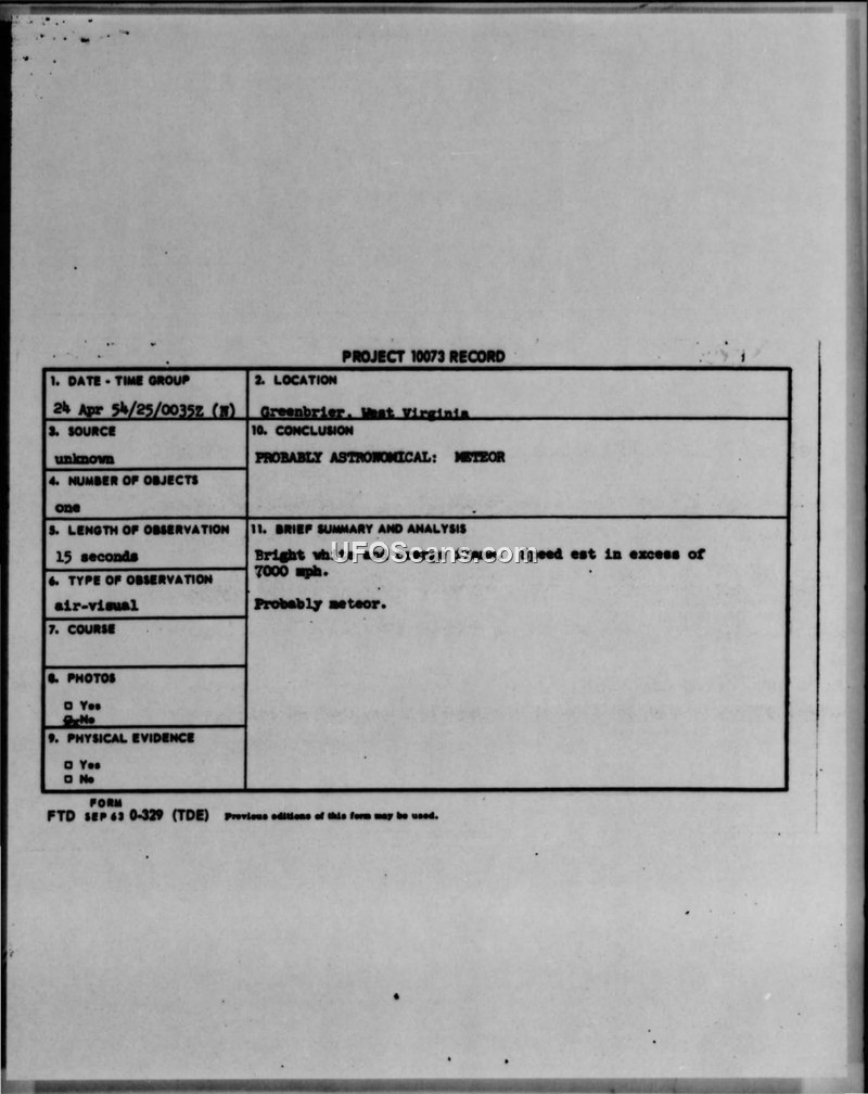 Project 10073 Record — Greenbrier, West Virginia, 24 April 1954