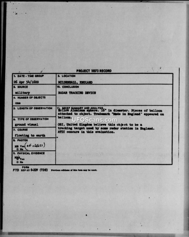 A spherical object recovered at RAF Mildenhall in 1954 was identified by the Air Technical Intelligence Center as a radar tracking target. The object consisted of a 16-inch aluminum sphere with attached balloon fabric.