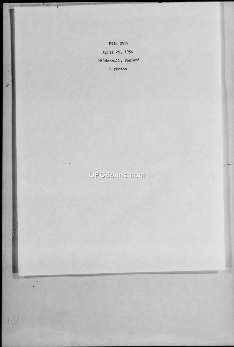 This file contains two photographs from an OSI investigation in Mildenhall, England, dated April 26, 1954, showing metallic, bowl-shaped objects and fibrous material. No narrative report or conclusion is included.