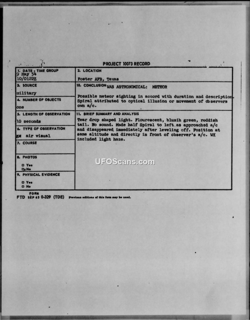 Project 10073 Record — Foster AFB, Texas, 9 May 1954