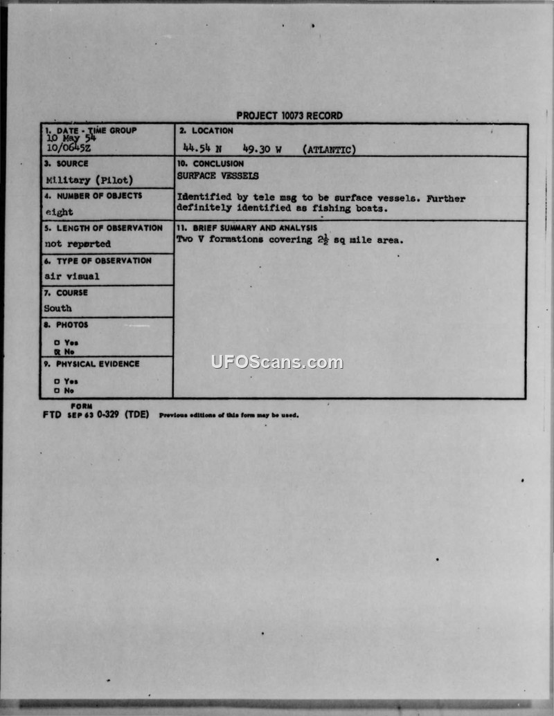 Project 10073 Record: Sighting of Surface Vessels, 10 May 1954
