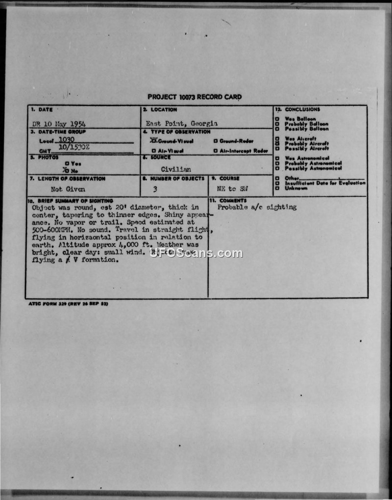 A former B-36 gunner reported three unidentified, shiny, round objects flying in a V formation over East Point, Georgia, on 10 May 1954. Despite the witness's credibility, the Air Force officially classified the event as a probable aircraft sighting.