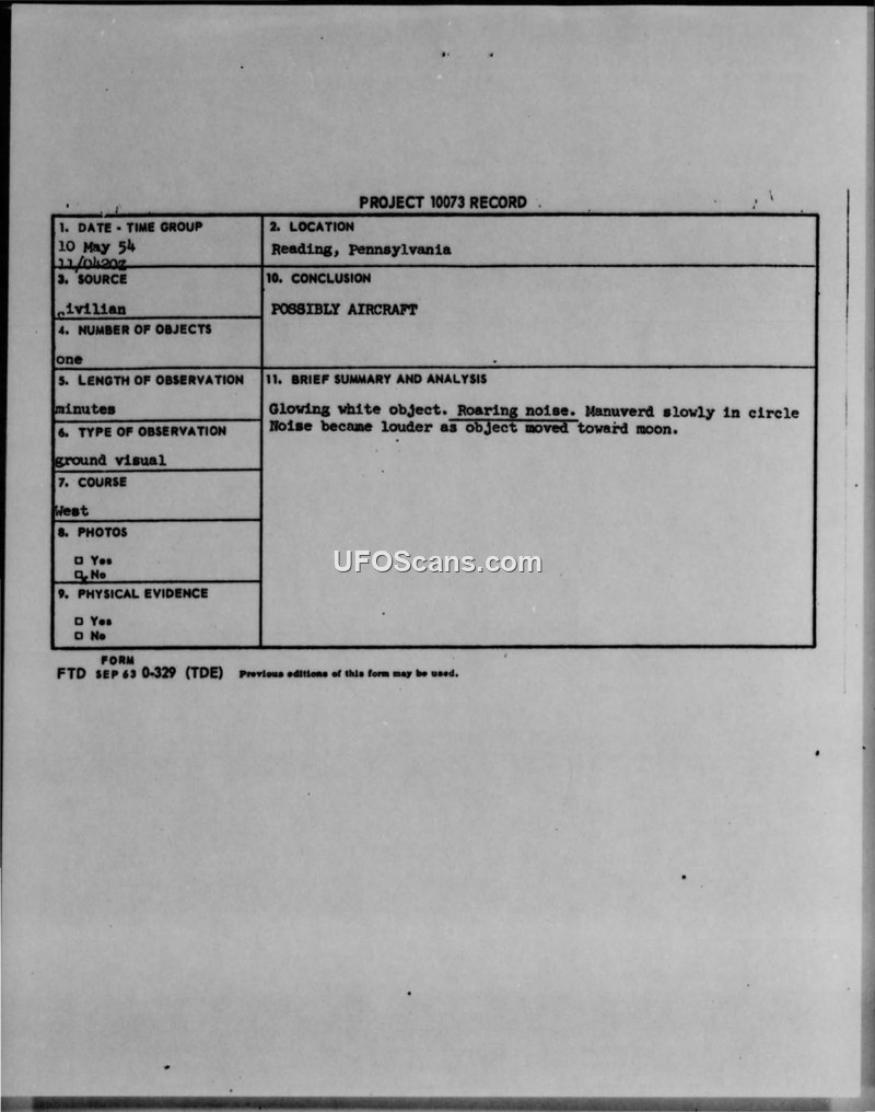 Project 10073 Record — Reading, Pennsylvania, 10 May 1954