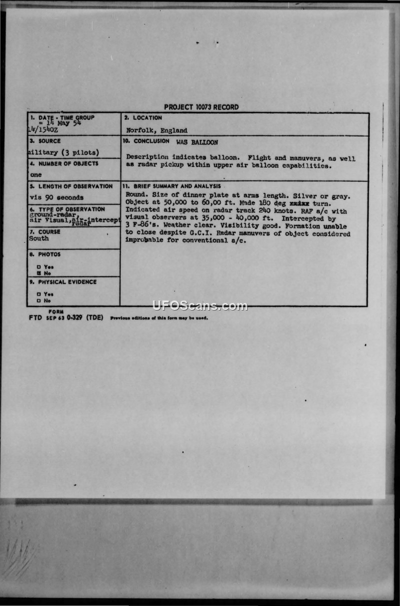 Project 10073 Record — Unidentified Flying Object Report, Norfolk, England, 14 May 1954