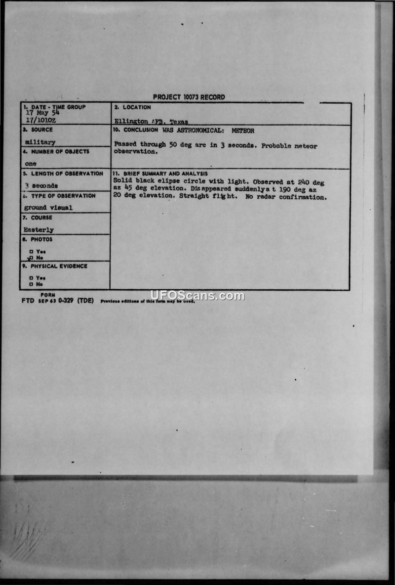 A military pilot reported a solid black elliptical object on May 17, 1954, at Ellington AFB. The official investigation concluded the sighting was likely a meteor, while noting the witness may have been fatigued.