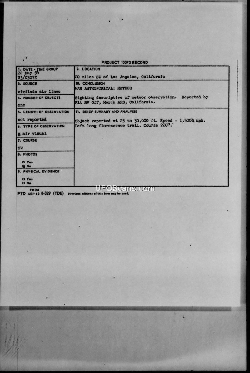 Project 10073 Record: Sighting 22 May 1954, Los Angeles, California