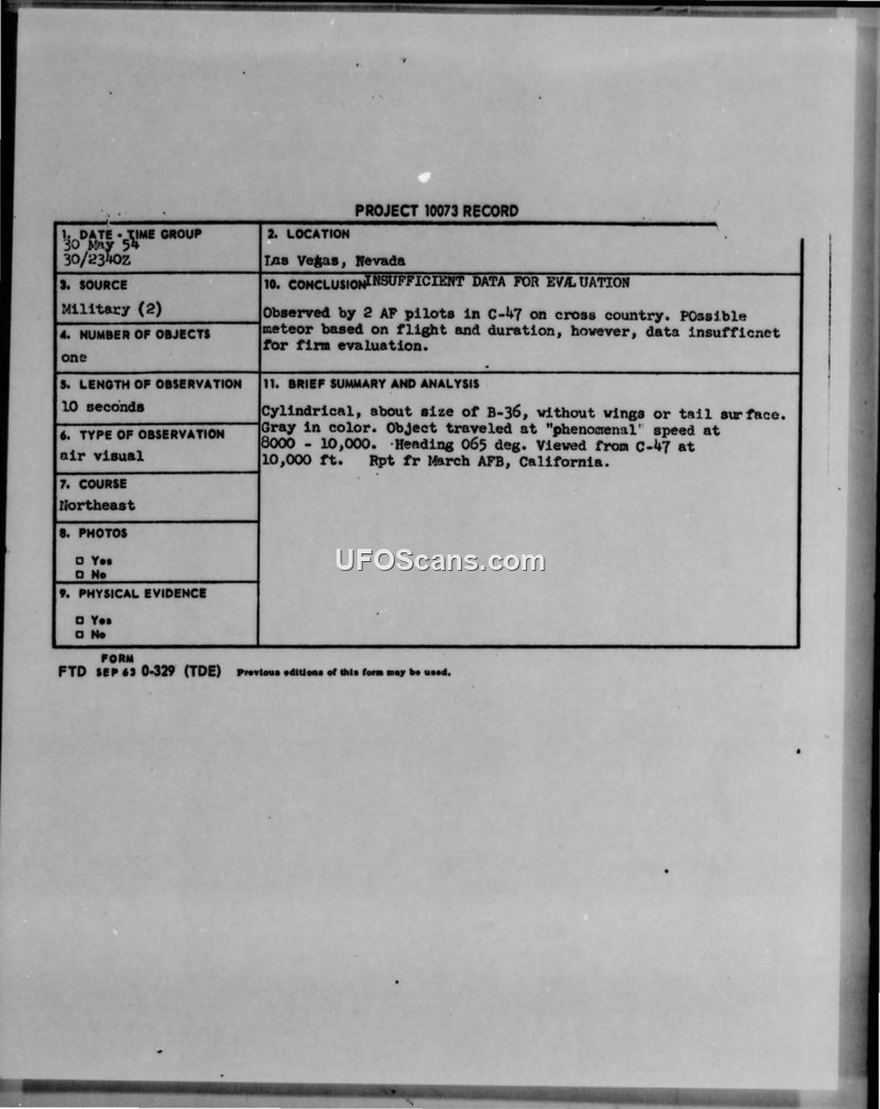 A 1954 Air Force report documents a sighting of a cylindrical, wingless object by two pilots near Las Vegas. The investigation concluded there was insufficient data for a firm evaluation, noting a meteor as a possible explanation.