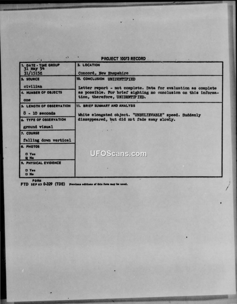 Project 10073 Record — Concord, New Hampshire, 31 May 1954