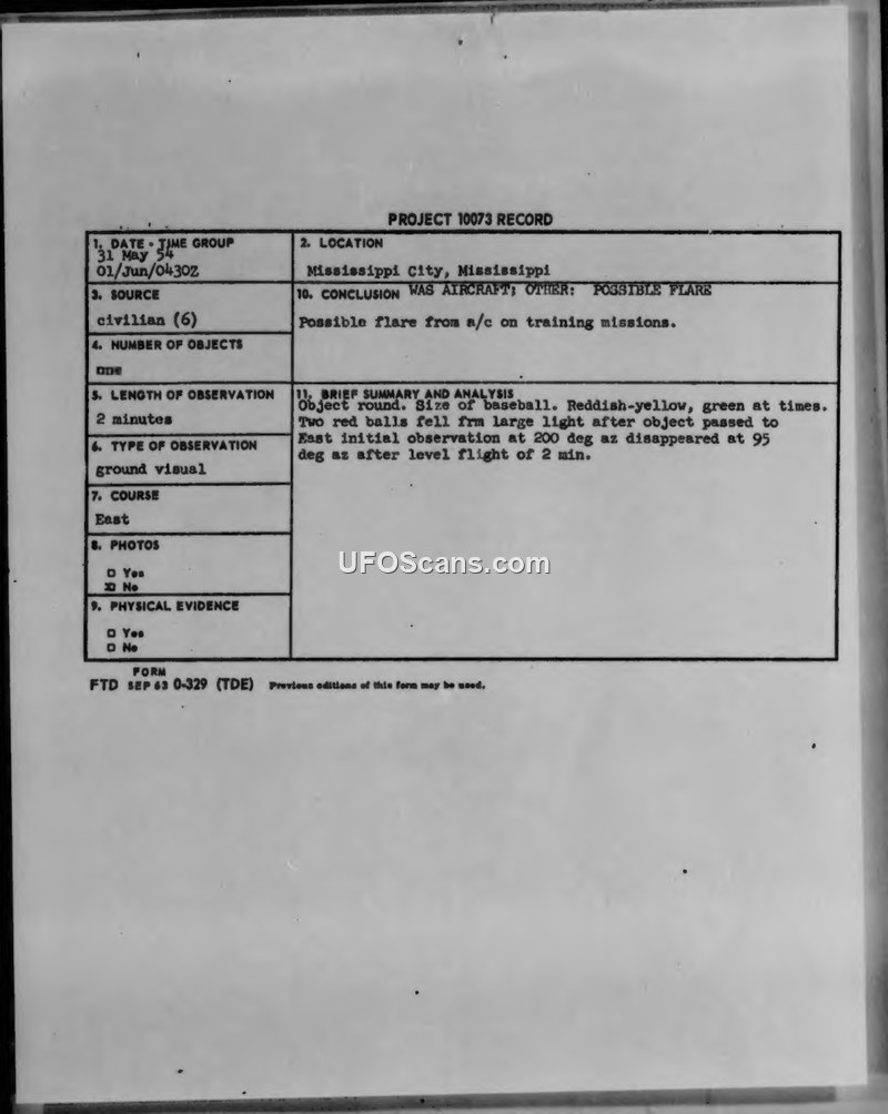 A 1954 sighting report from Mississippi City describing a round, multi-colored aerial object. The official conclusion attributed the sighting to a flare from a training aircraft.