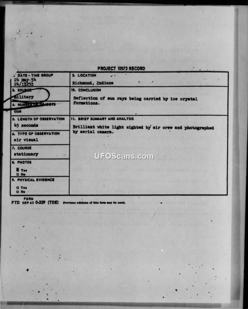 Project 10073 Record: Richmond, Indiana Sighting, 24 May 1954