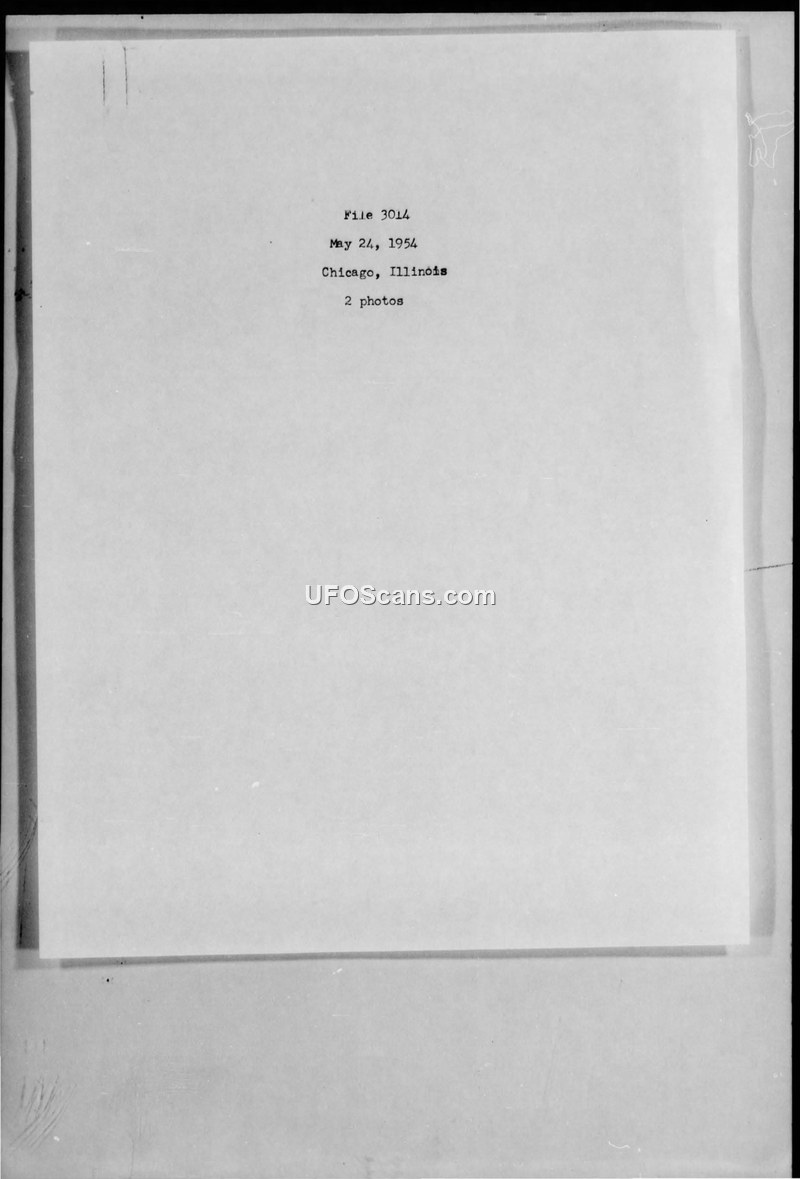 This document, identified as File 3014, serves as a brief record of a sighting incident that occurred in Chicago, Illinois, on May 24, 1954. The document contains minimal textual information, consisting only of the file number, the date, the location, and a note indicating that two photographs are included as part of the record. The second page of the document provides these two photographic images, which appear to depict an unidentified object in the sky. No further narrative, witness testimony, or official analysis is provided within the provided pages.