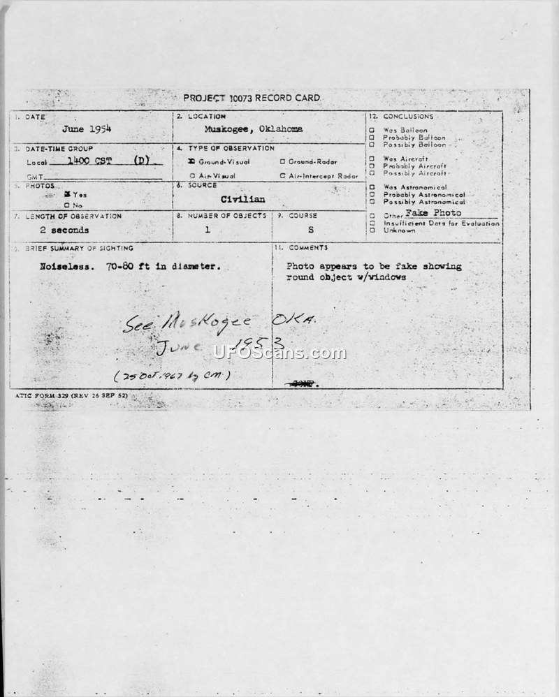 A 1954 sighting report from Muskogee, Oklahoma, was officially dismissed by the ATIC as a fake photograph. The document also contains a handwritten cross-reference to a 1953 incident.